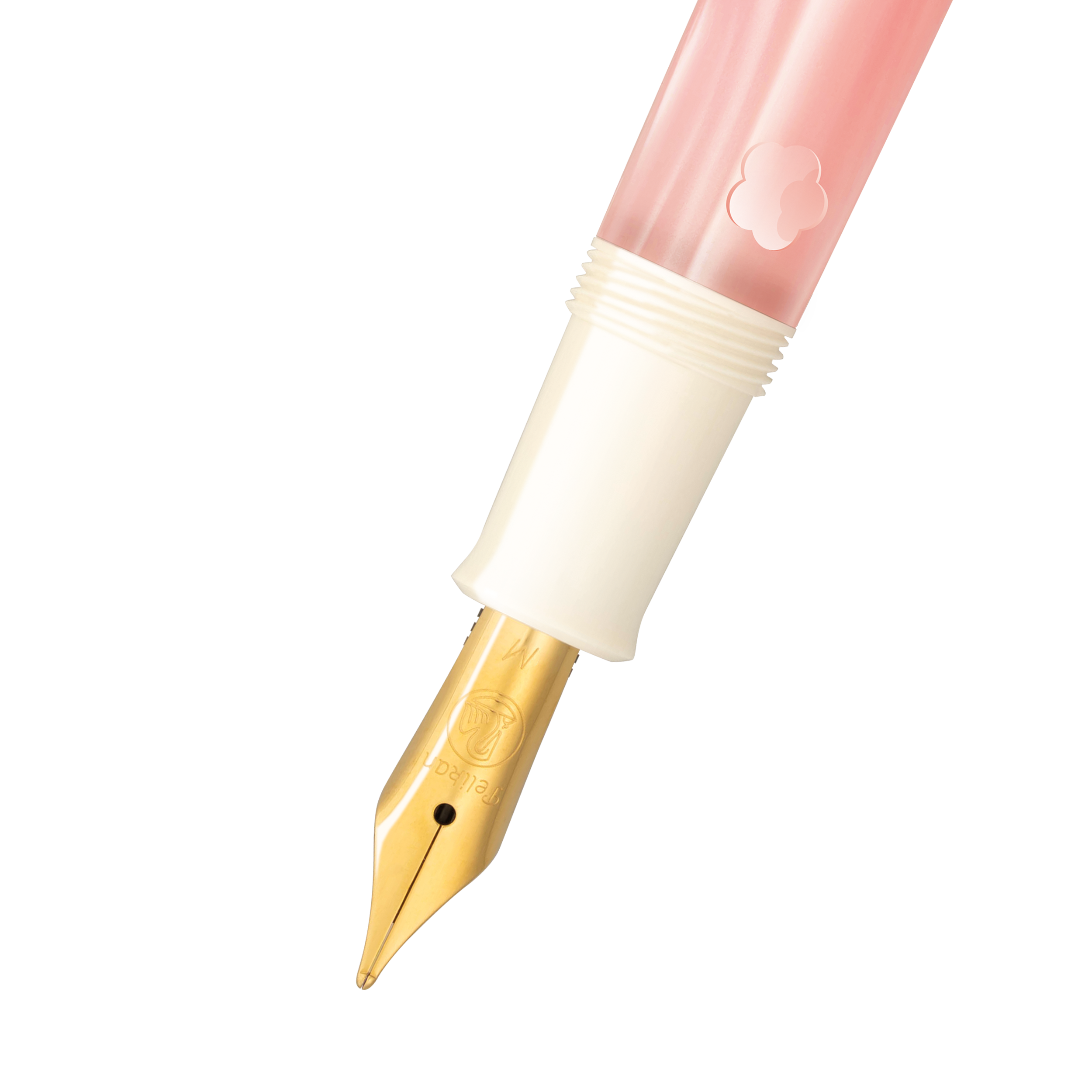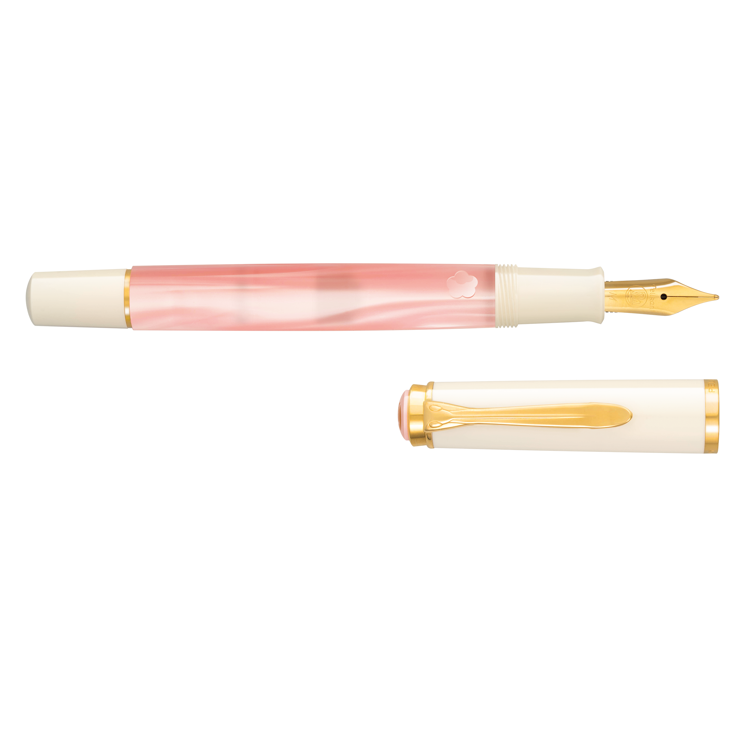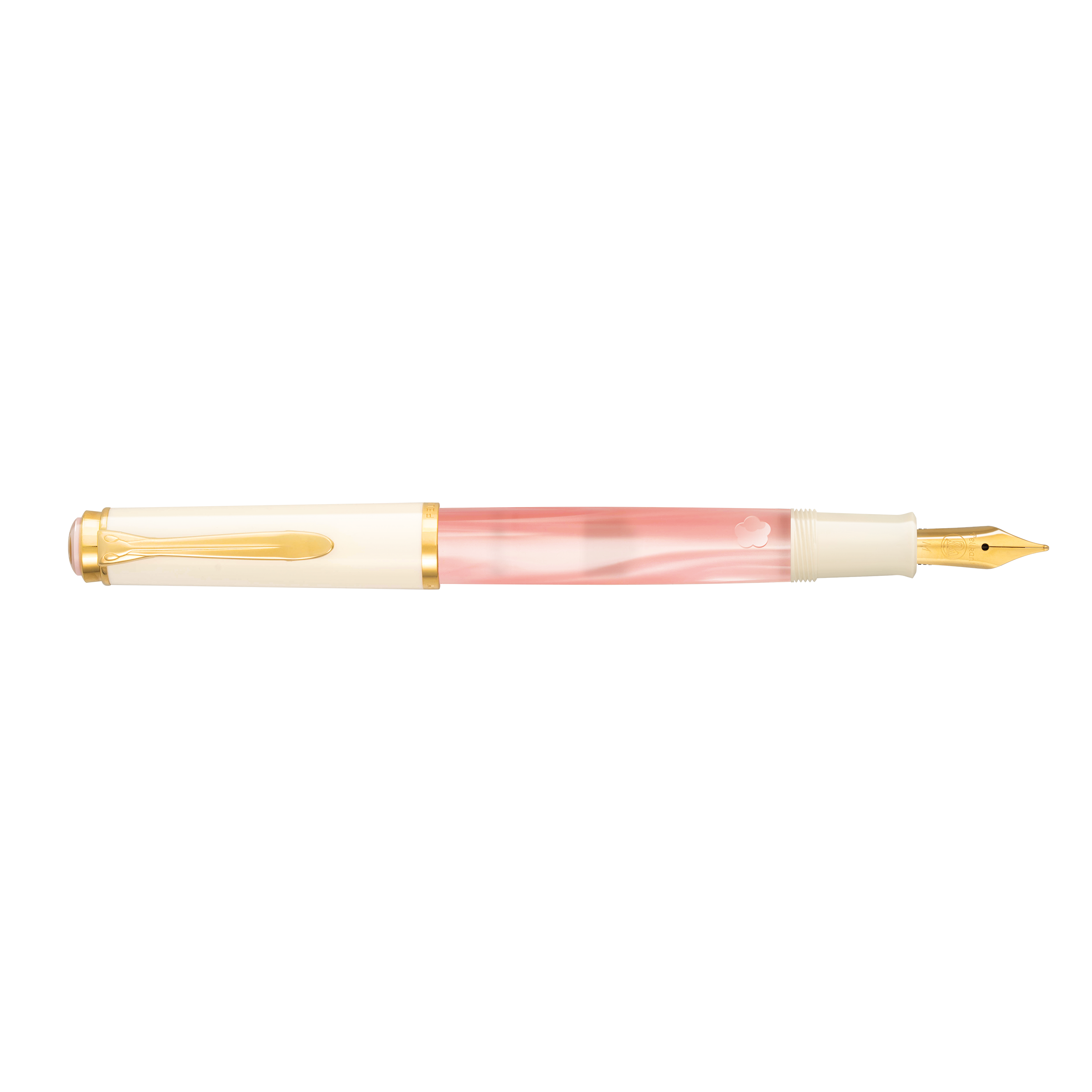 Soft, pale pink resin mirrors the gentle hue of blooming cherry blossoms, creating a serene and elegant aesthetic. The ink windows, shaped like delicate cherry blossom flowers, offer a poetic glimpse into the pen’s inner workings, while the pristine white cap and gold-plated clip and rings add a luxurious finish.